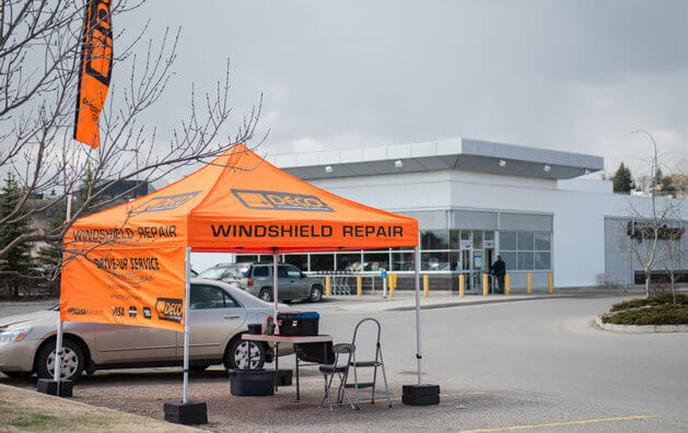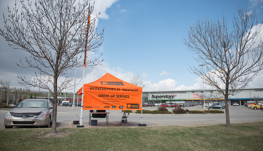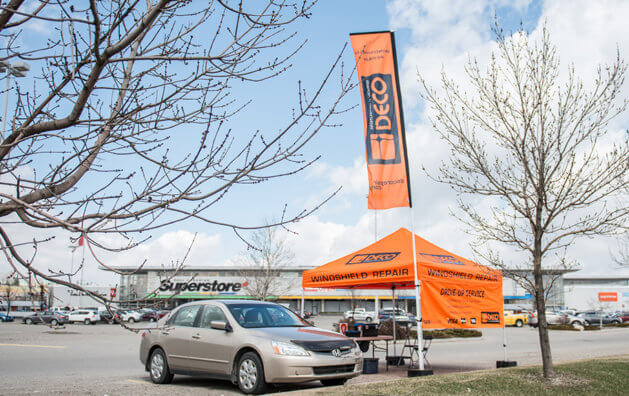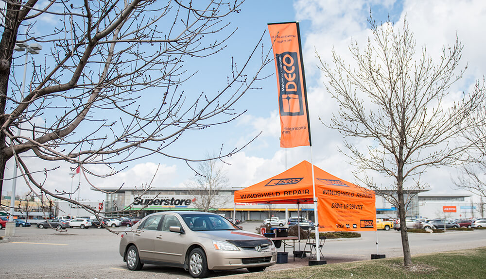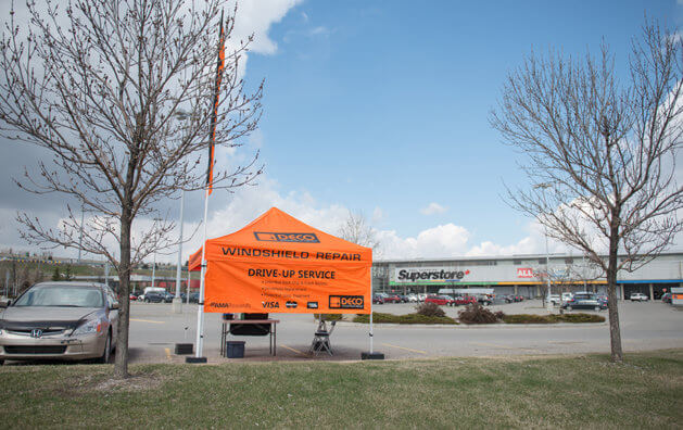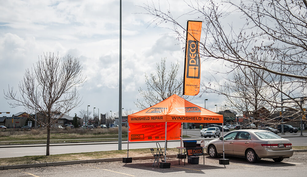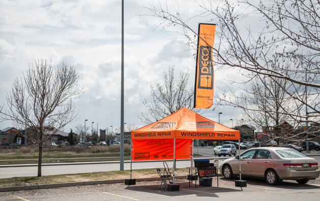 DECO Orange Tents are conveniently set up on the parking lots of one the busiest Shopping Centres/Malls in the cities. The colour of the tents had been chosen for them to stand out and attract attention. No appointments necessary, we offer drive-up services. Our business is seasonal, as we are weather dependent. Mobile repairs, scheduled to customer’s house/work are available in the off-season in selected Regions by additional fee. Windshield damage is something most of us will experience while driving a vehicle. At DECO Windshield Repair RCS Heritage Meadows, we repair stone damage or stone "chips" up to the size of a Toonie, as well as a single long crack up to a length of 24 inches. Best results are obtained when the damage is repaired right away, before it gets contaminated from car washing, road grime or inclement weather. It's better to get it done before the damage spreads. The development of more sophisticated tools and superior resins has enabled windshield chip repair to become an economically, environmentally and physically sound process when properly performed by a trained professional. In addition to our orange shopping centre kiosks DECO also offers on-location mobile service at your home or workplace. Book Windshield Repair service now with DECO Windshield Repair RCS Heritage Meadows.